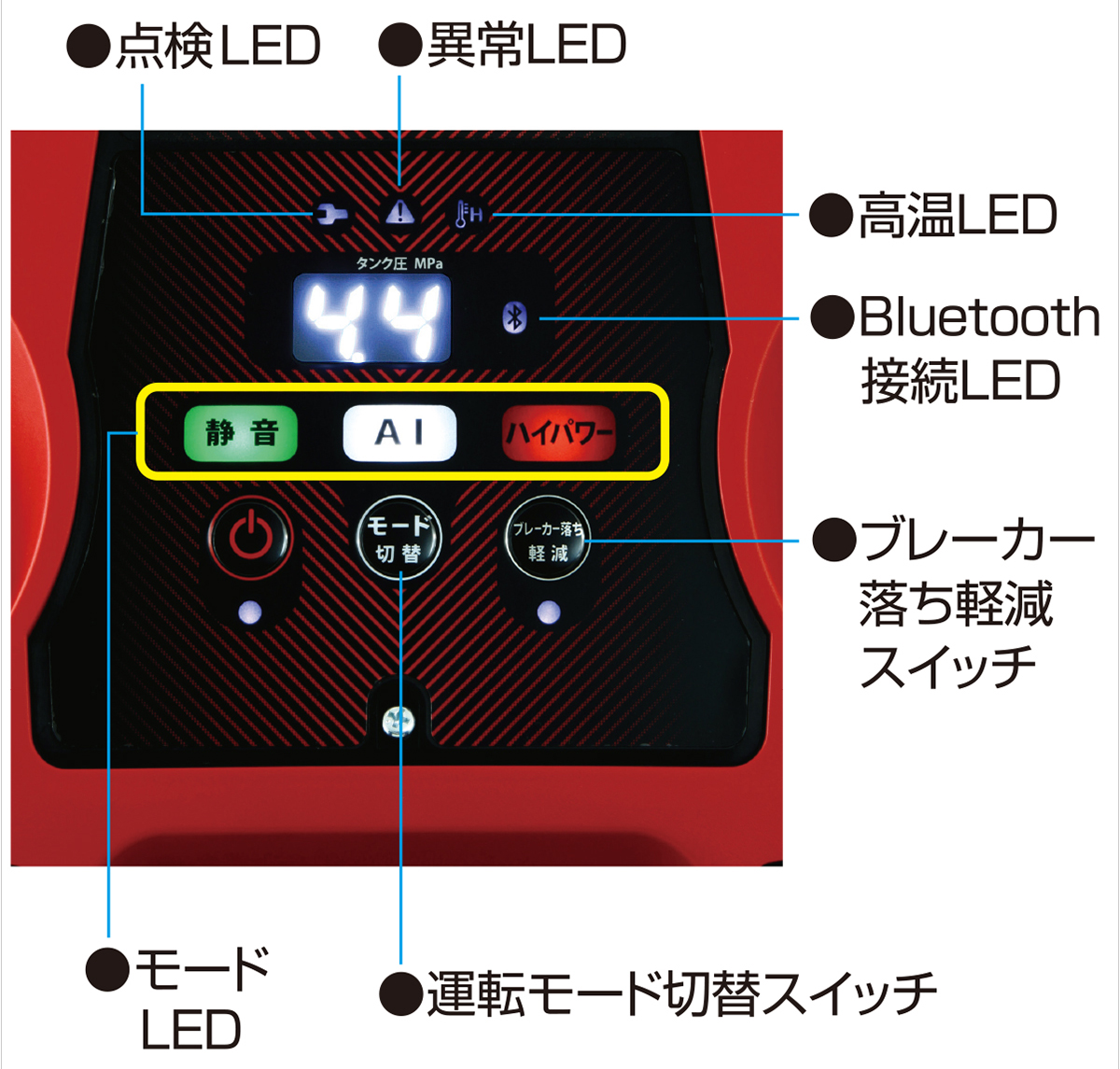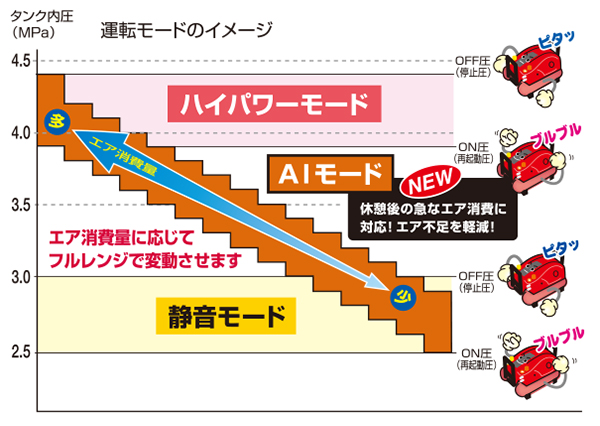 | 圧力制御範囲 | ・静音モード(内装) ON圧 約2.5MPa OFF圧 約3.0MPa ・AIモード(下地・内装) ON圧 約2.5MPa~約3.9MPa OFF圧 約2.9MPa~約4.4MPa ・パワーモード(根太レス・金物) ON圧 約3.9MPa OFF圧 約4.4MPa |