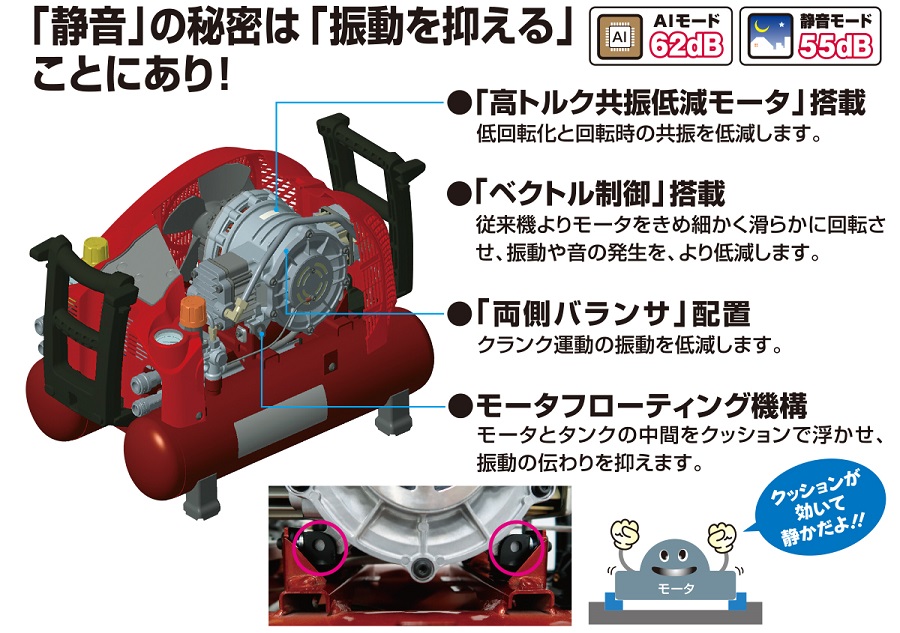 | 回転速度 | ハイパワーモード運転時 最大3,400回転/分、AIモード運転時 最大2,450回転/分、静音モード運転時 最大1,600回転/分 |
